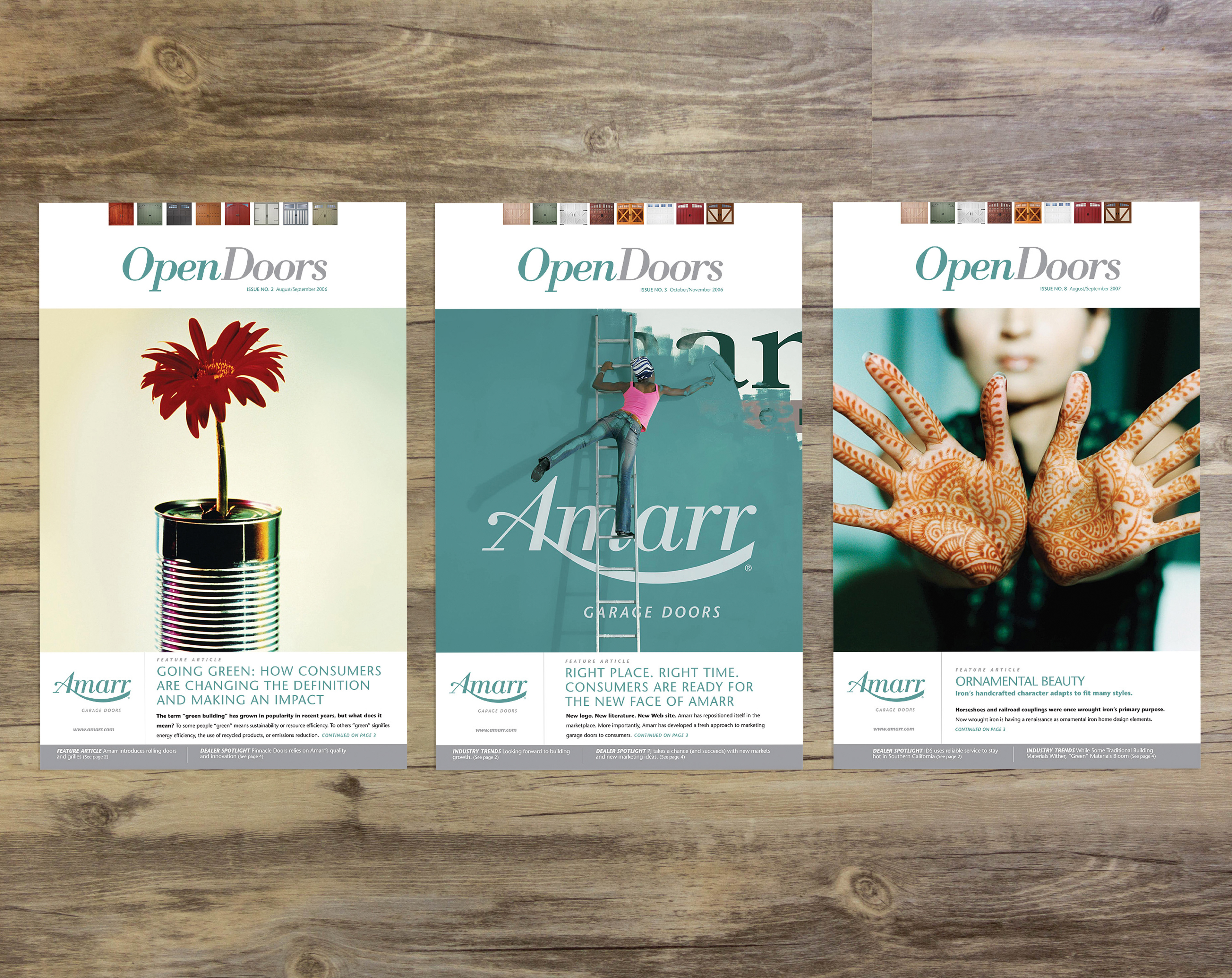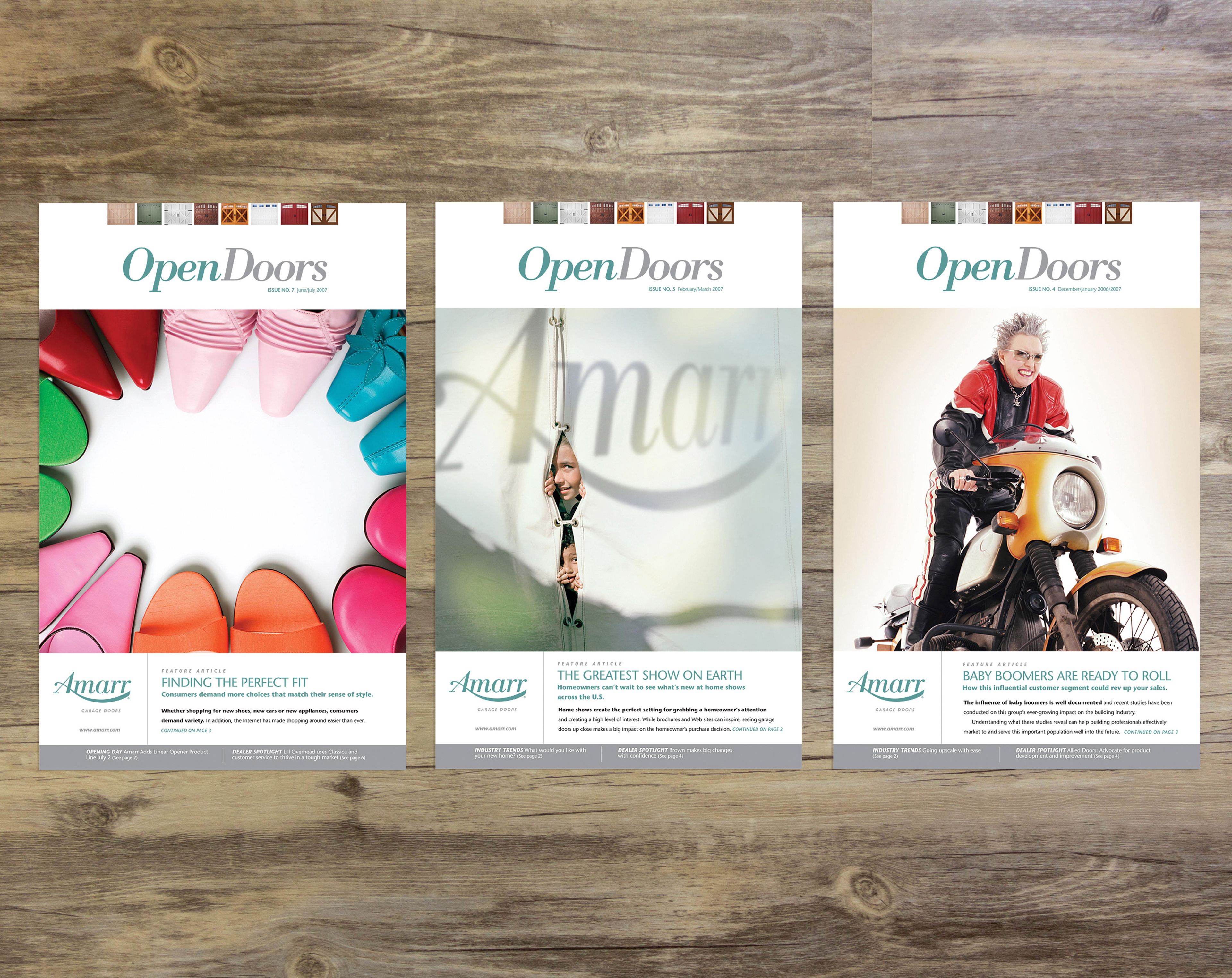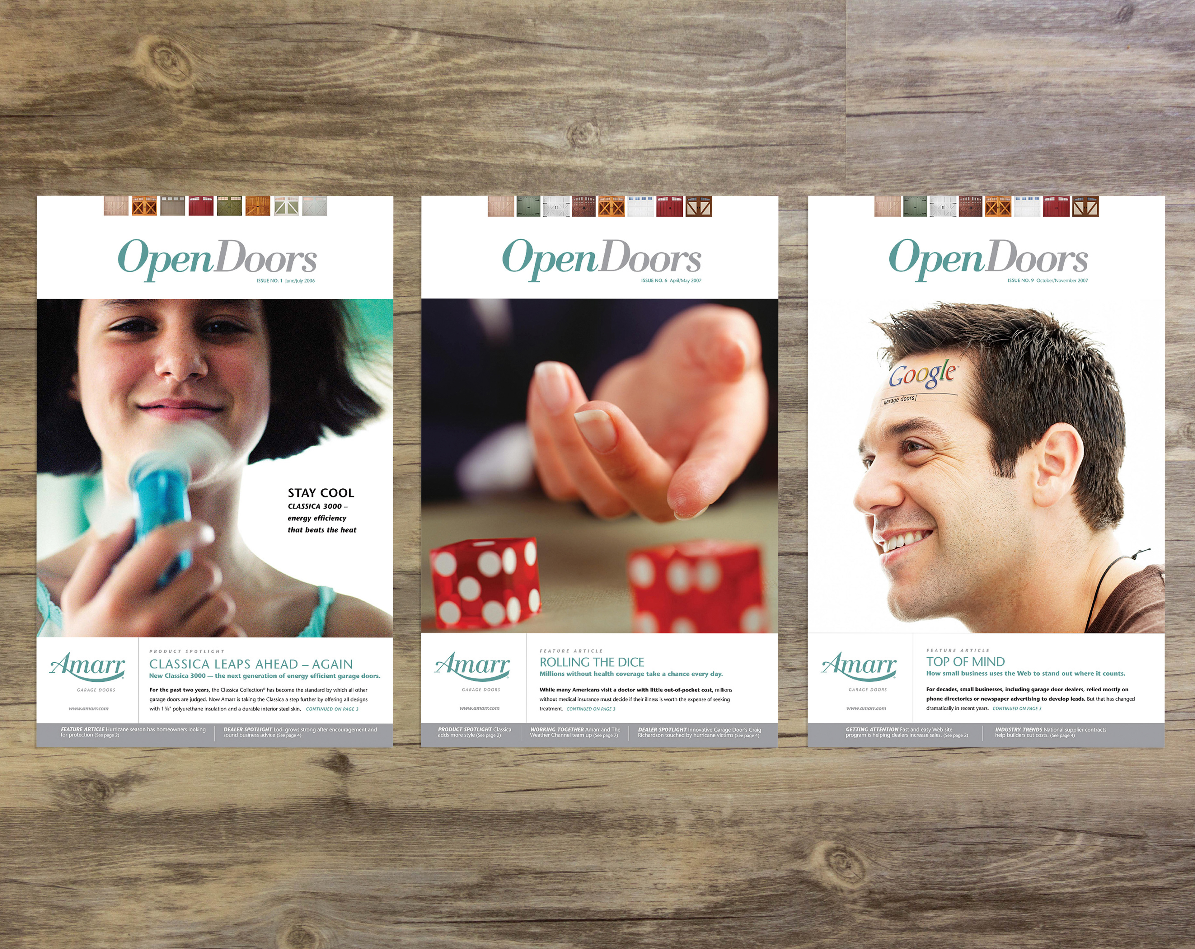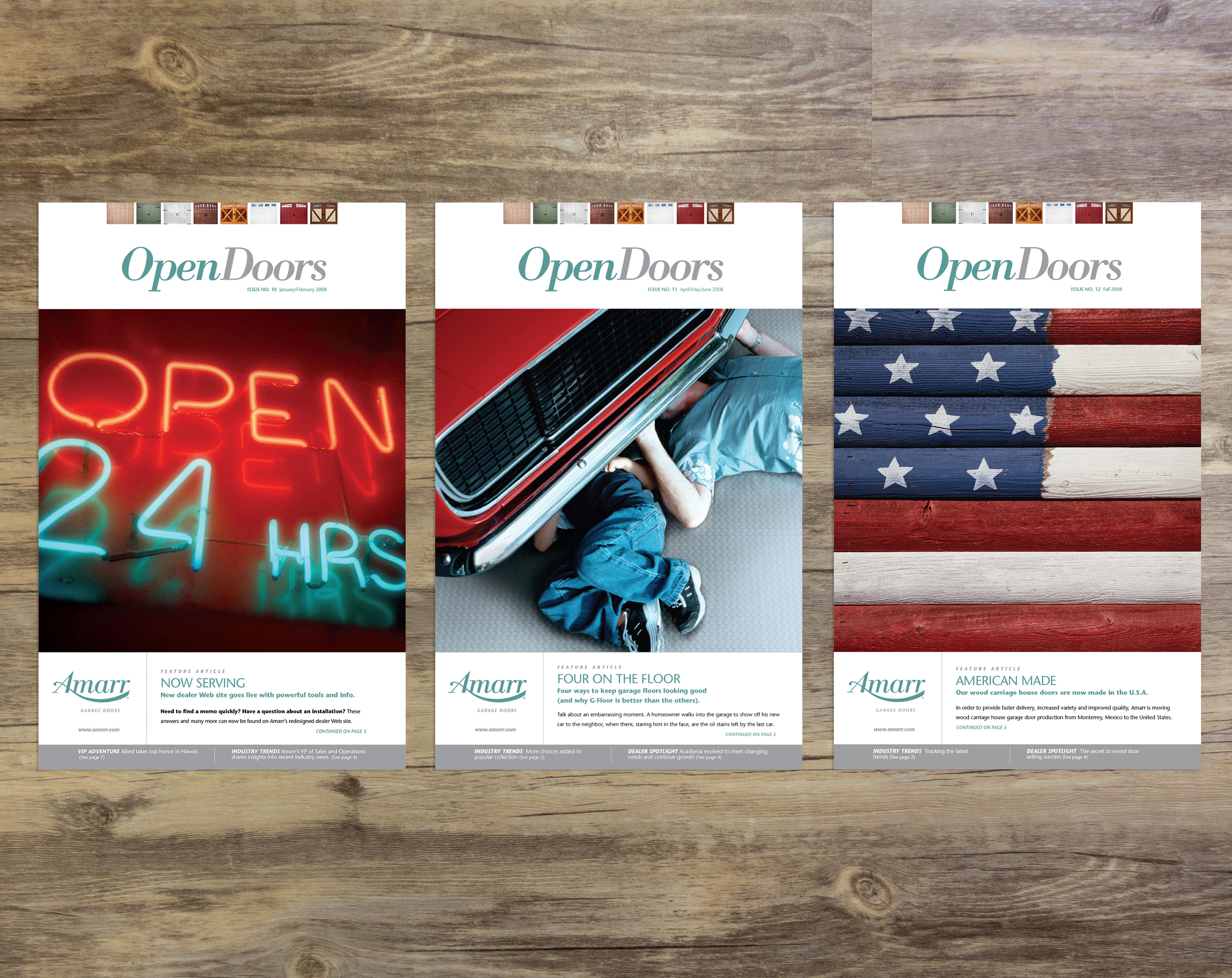 Created the Open Doors publication with magazine style covers, industry news stories and product features for Amarr Garage Door Dealers